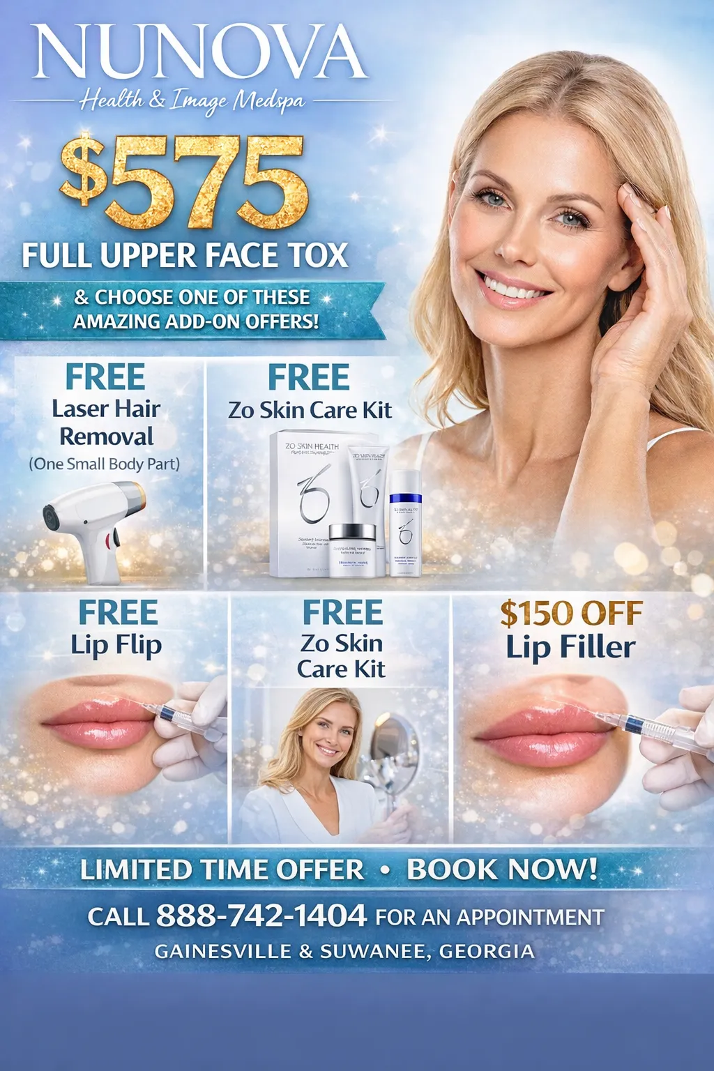 - $575 for full upper face cosmetic tox combined with one of our free offers